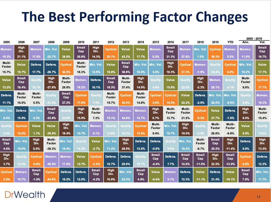 This is largely because individual factor performance can be very cyclical. During the webinar, Alvin pointed out that the best performing factor frequently changes year to year. In 2017, the top performer was the momentum factor. Minimum volatility topped in 2018. In 2019, it was cyclical’s turn. Year to date, the best performing factor currently is once again momentum.