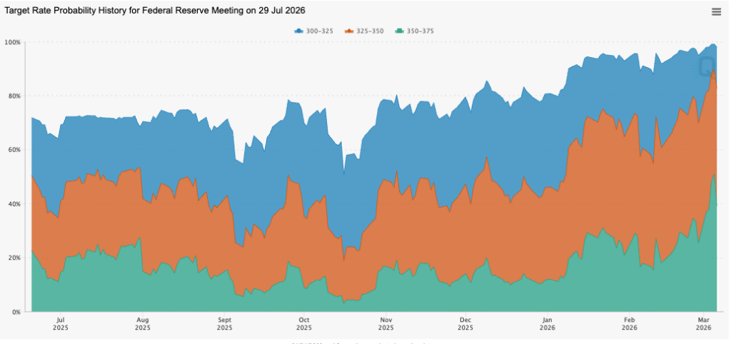 The biggest risk in this basket is a reversal in US inflation, which, incidentally, was intensified by another war just a few years ago. Progress in pushing down prices has been hard-won. Even if the new Fed chair is inclined towards rate cuts, he and other voting members of the Federal Open Market Committee would have to contemplate the effects of elevated oil prices. In the futures market, traders are raising the probability of the Fed resisting rate cuts as far out as July (the green portion of the chart below represents bets on the rate range staying at 3.5%-3.75%).