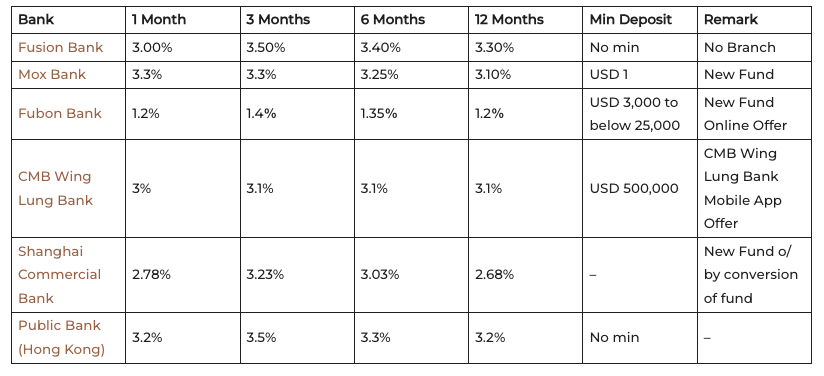 - Top Rate: Hang Seng Bank offers the highest rate at 3.5% for 3 months (min. USD 100,000)