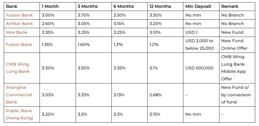 - Traditional Banks: Hang Seng Banklead with a 3.5% annual interest rate for 3-month and 6-month deposits