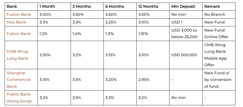 China Construction Bank (Asia) offers the highest rate at 3.45% for 1 month (min. USD 10,000) - Digital Banks: Fusion Bank (3.50% for 3 months, 6 months, 12 months) is competitive for low or no minimum investments.