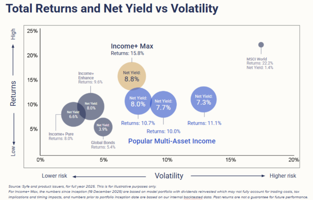 The chart below shows the strategy’s superior returns (15.8%) compared to Income+ Pure (8.0%), Income+ Enhance (9.6%), and global bonds (5.4%) in 2025, with about only two percentage points more in volatility. MSCI World, which represents developed markets equities, delivered a higher return at 22.2%, but that came with more than double the annualised volatility.