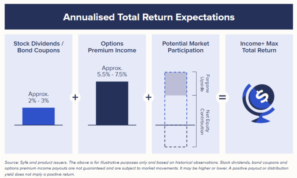 Income+ Max is managed by Syfe’s experienced investment team, and constructed with “active ETF” building blocks from J.P. Morgan Asset Management (JPMAM), the world’s largest active ETF provider, and ETF solutions experts REX Advisors LLC and First Trust Advisors L.P..
