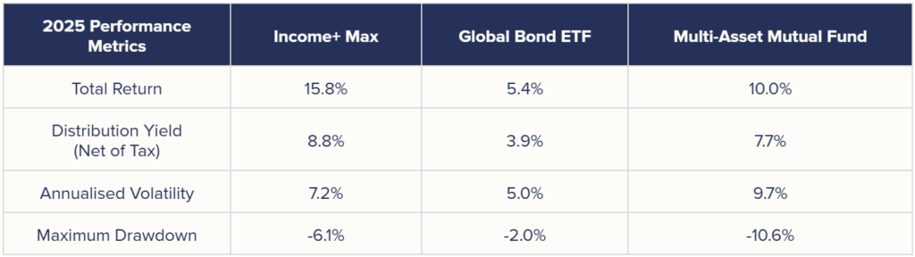 Likewise, we believe Income+ Max is also more optimal in risk and reward than the comparables available in the Hong Kong market. Income+ Max would have produced superior returns (15.8%) in 2025 with reduced volatility, compared to one of the largest HK multi-asset mutual funds (10%), with similar distribution yield.
