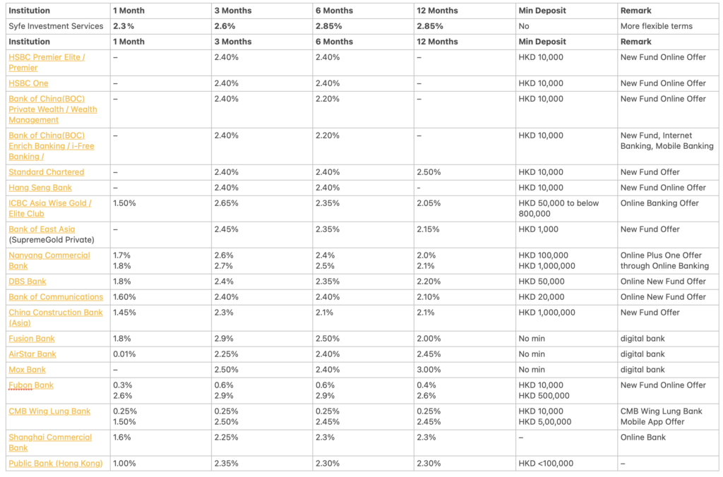 Fusion Bank offers the highest 3-month rate at 2.9%, closely matched by Fubon Bank‘s 2.9% new-fund promotion (HKD 500,000 tier). Syfe provides a solid 2.6% with zero entry barrier and no early-withdrawal penalty.