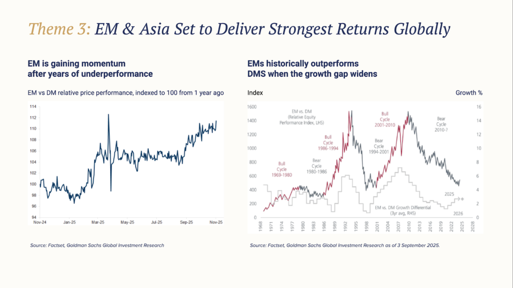 Emerging Markets & AsiaOverweight (selective)Higher trend growth, USD tailwind, improving earnings. Returns driven by country/sector selection, not index beta.FX volatility; China AI and policy executionStructural diversifier with volatility tolerance