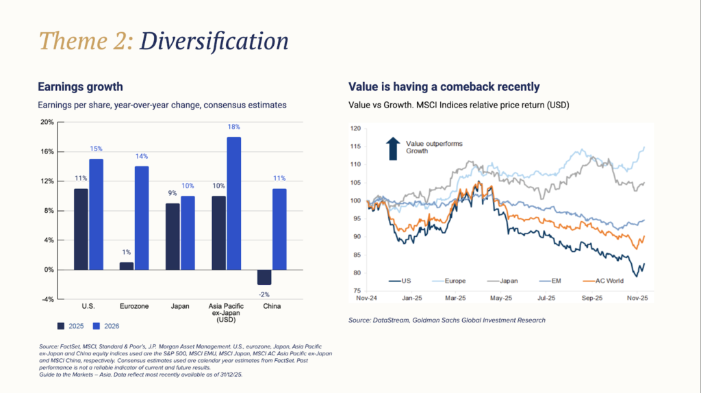 Crucially, earnings breadth has improved. In 2025, earnings upgrades extended beyond a narrow group of US mega-caps into Europe, Japan, and parts of EM, driven by better cost discipline, margin resilience, and more shareholder-friendly capital allocation. Factor strength is starting to emerge as ‘growth’ stocks face valuation test and ‘value’ stocks show signs of revival.