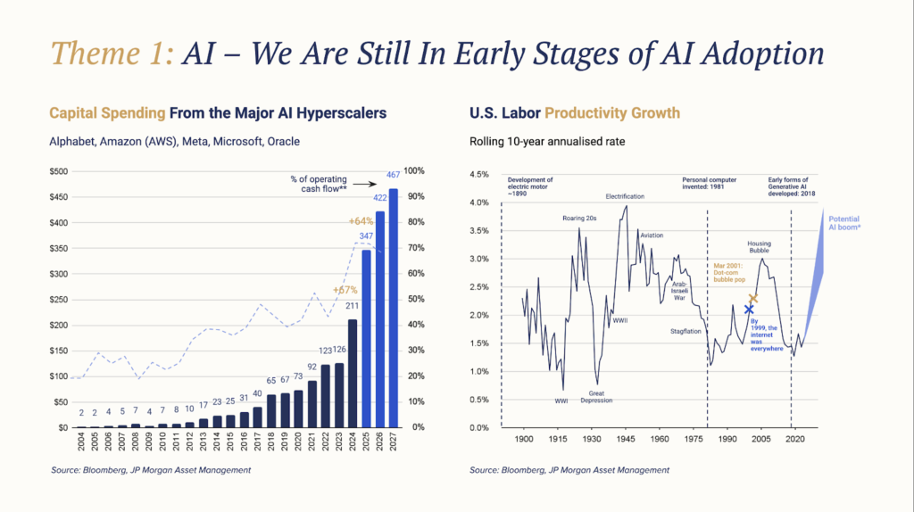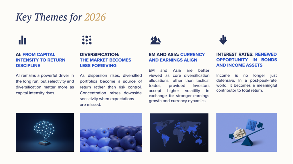 AI remains a powerful long-term driver, but returns in 2026 are increasingly shaped by ROI discipline, balance-sheet strength, and execution. Selectivity and diversification matter more as capital intensity rises.