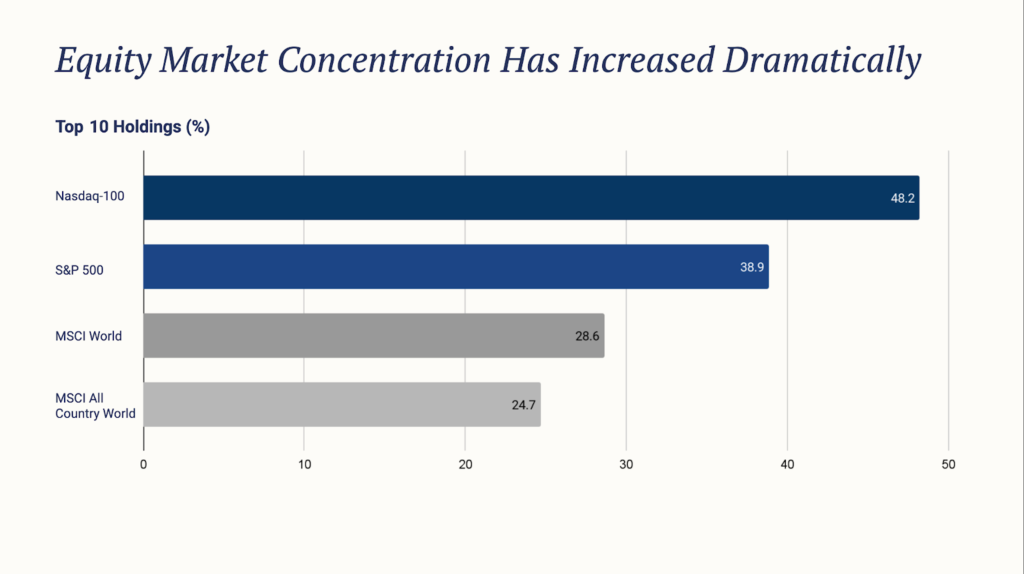 The top 10 US stocks account for roughly 40% of S&P 500 market capitalisation, a level historically associated with higher return dispersion and lower tolerance for valuation mistakes.