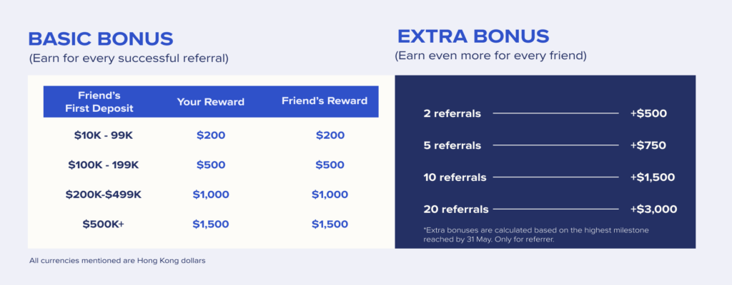 Extra bonuses are calculated based on the highest milestone reached by 31 May. (*T&C apply). All currencies mentioned are Hong Kong dollars.