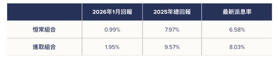 資料來源:Syfe。產品發行人。數據截至 2026 年 1 月 31 日,以投資組合計價貨幣計算,四捨五入。由於存款、提款時點及組合權重不同,各組合實際回報或有差異。