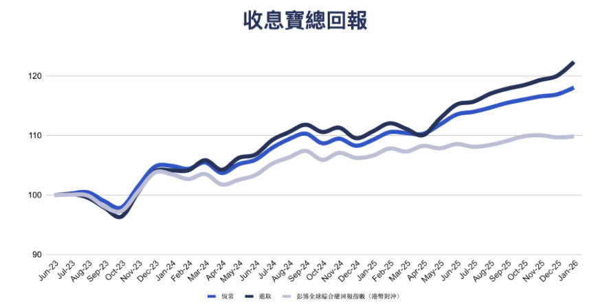 收息寶在本月再次錄得強勁且穩定的正回報。收息寶 – 進取組合 回報 +1.95%,得益於其股票曝光;收息寶 – 恒常組合 則錄得 +0.99%,其投資組合 100% 配置於固定收益資產。