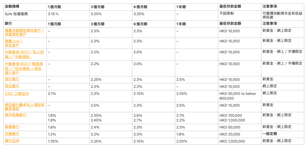 最佳1個月港元定存利率 目前1個月期港元定期存款同類產品中,在傳統銀行工銀亞州提供2.1%的年利率,但最低存款需達HKD 50,000;中銀香港有不錯表現,存HKD 10,000以上可得2.5%,需通過網上申請。至於Syfe投資服務提供最高利率達3.10%,而且不設最低存款金額,並可選擇自動本息再投資,極為適合小額或短期靈活配置資金需求。