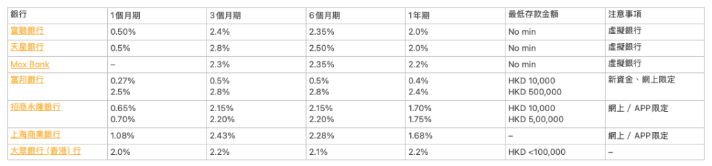 香港虛擬銀行/中小型銀行港元定存利率比較