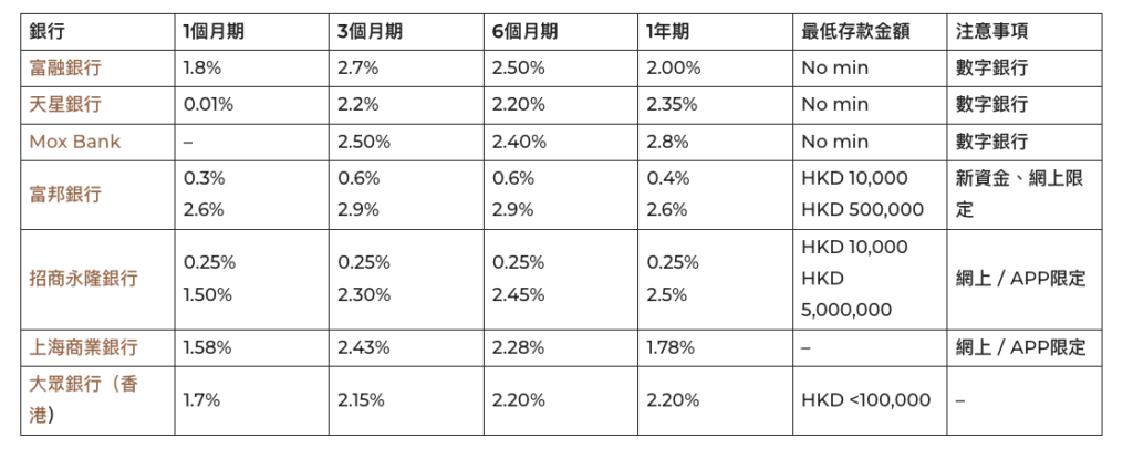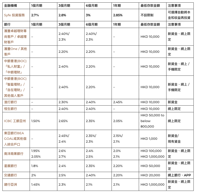 傳統銀行的6個月港元定存利率均低於2.5%,傳統大行滙豐、中銀及渣打介乎2.2%至2.4%年利率,較為進取的數字銀行富融銀行提供2.5%的3個月定存利率;至於Syfe投資服務年化回報率達3%,不設最低存款門檻。