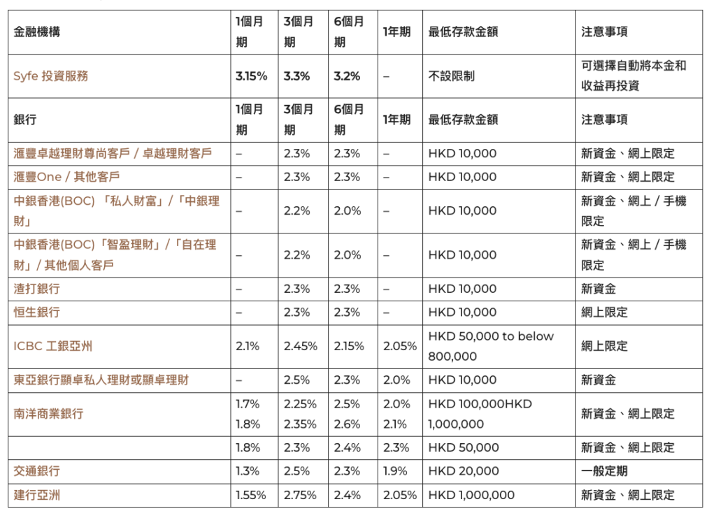 最佳1個月港元定存利率 目前1個月期港元定期存款同類產品中,在傳統銀行工銀亞州提供2.1%的年利率,但最低存款需達HKD 50,000;富融銀行有不錯表現,1個月期定存亦有2%,但需通過網上申請。至於Syfe投資服務提供最高利率達3.15%,而且不設最低存款金額,並可選擇自動本息再投資,極為適合小額或短期靈活配置資金需求。