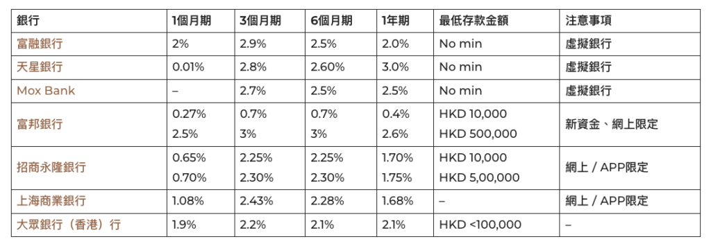 香港虛擬銀行/中小型銀行港元定存利率比較