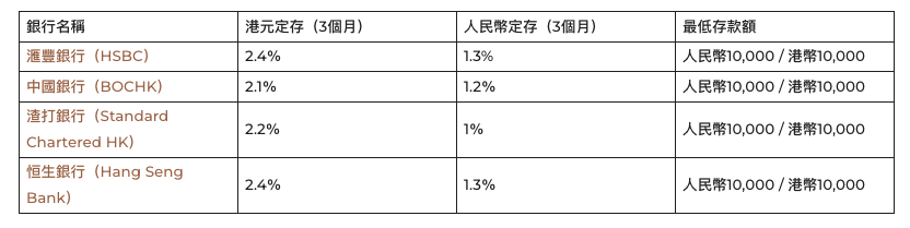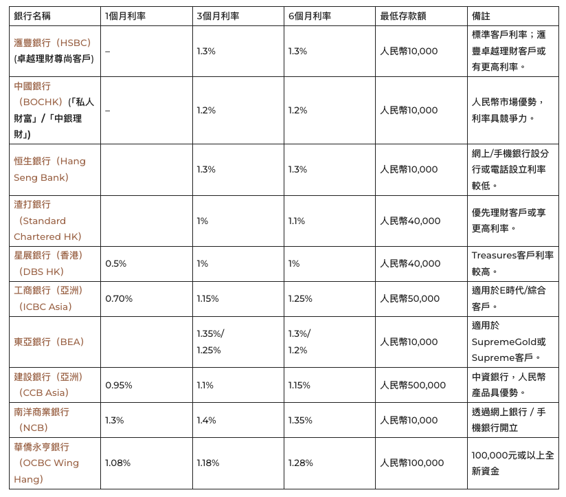 下表列出香港十大傳統銀行的人民幣定期存款利率,數據來自官方網站及提供的文件。利率為年化(p.a.),可能因市場變化而調整,建議存款前向銀行確認。
