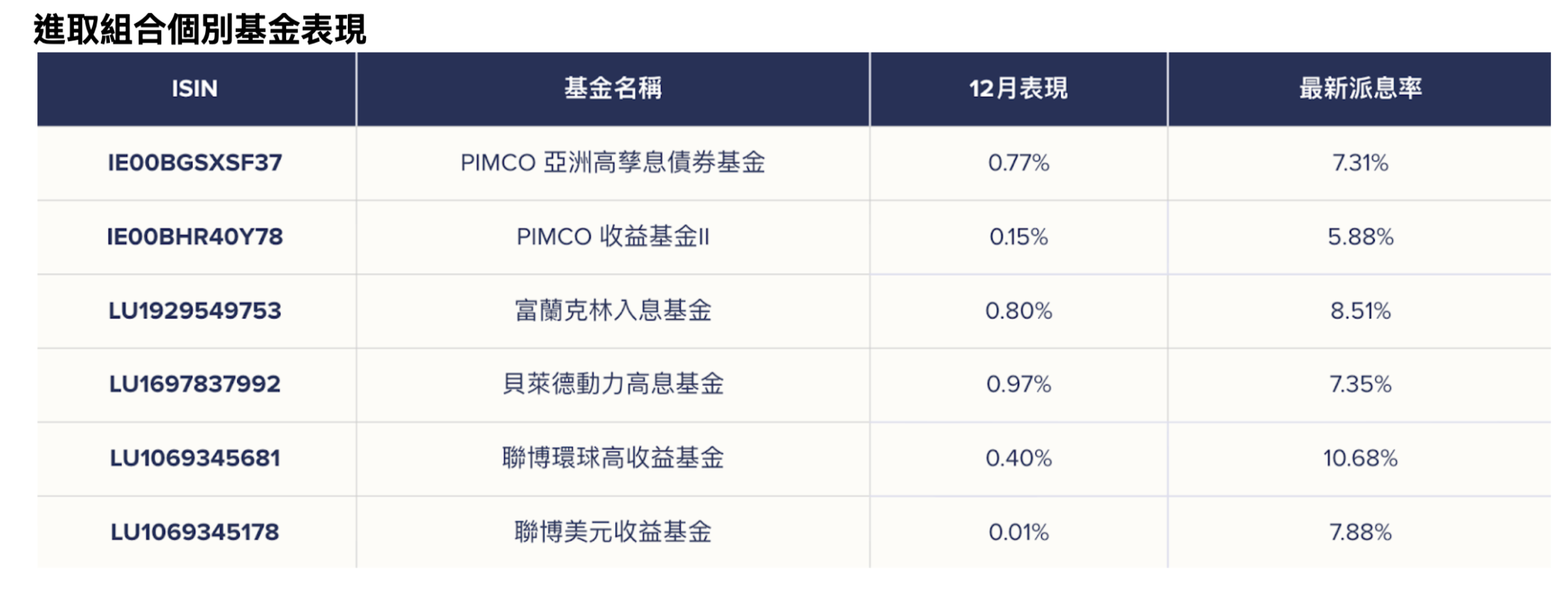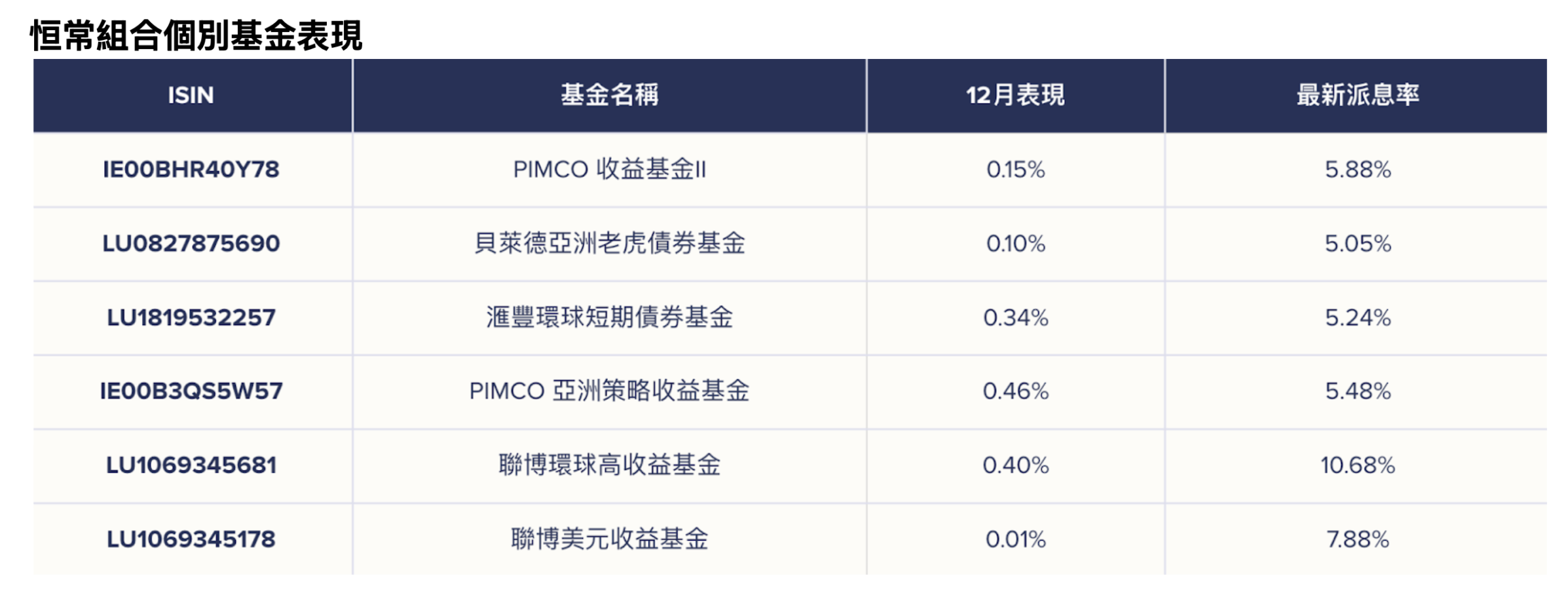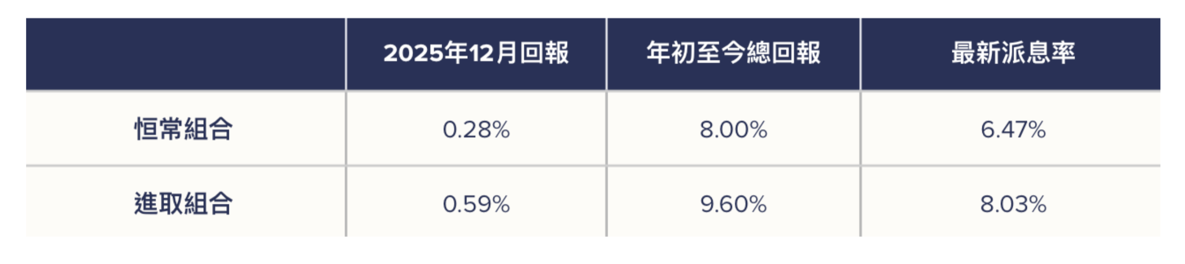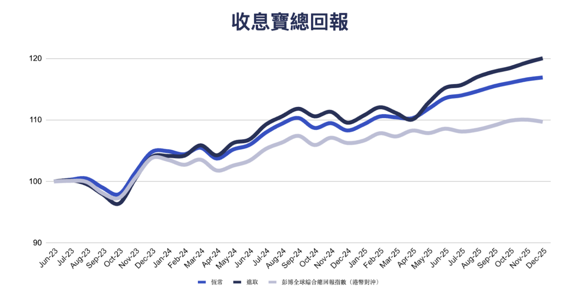 收息寶 – 恒常組合進取組合 本月分別錄得 +0.28%+0.59% 穩健升幅,2025全年回報分別為 8.0%9.6%。 我們的精選基金成功捕捉債市漲勢,為投資者提供穩定派息潛力,同時有效控制下行風險。