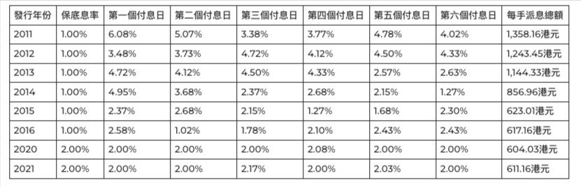 - 保證最低息率(Guaranteed Rate): 政府預設的最低年利率,確保即使在通縮或通脹低迷的環境下,投資者仍能獲得穩定回報 。投資者需要留意的是,歷年香港政府發行的iBond保證息率有所不同。例如2011年至2016年間發行的六批iBond,保證息率僅為1厘,但2020年的iBond,保證息率提高至2%。