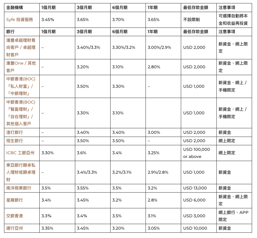 目前香港的銀行在1個月期美元定期方面,傳統銀行中的南洋商業銀行提供3.50%的年利率(最低存款USD 13,000,新資金限定),星展銀行提供3.40%(最低存款USD 6,000,新資金網上限定)。Syfe投資服務提供3.45%,不設最低存款金額且可自動再投資。