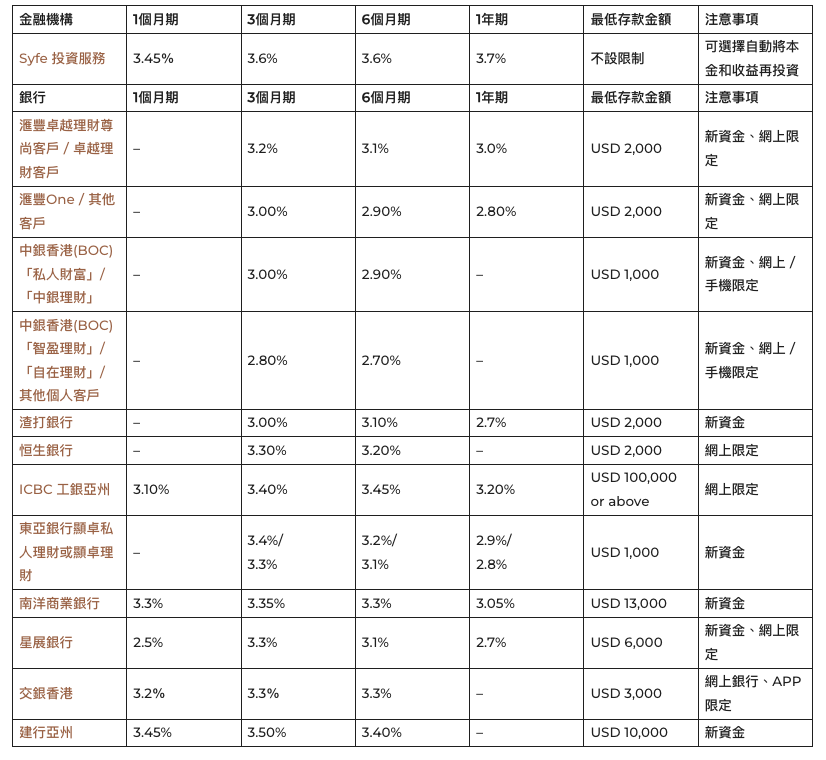 目前香港的銀行在1個月期美元定期方面,傳統銀行中的建行亞州提供3.45%(最低存款USD 10,000,新資金網上限定),而南洋商業銀行亦提供3.30%的年利率(最低存款USD 13,000,新資金限定),Syfe的1個期投資服務年化定期回報率達3.45%,不設最低存款金額且可自動再投資。