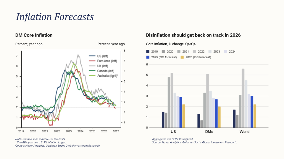 Disinflation driven by productivity and supply-side improvements is supportive for earnings and risk assets, reducing the likelihood that inflation alone forces a return to restrictive policy.