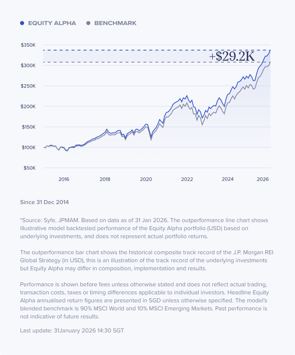 Syfe introduces Equity Alpha, a global equity portfolio designed for investors seeking consistent alpha, or excess return above the market, through disciplined, research-led stock selection. The portfolio is powered by J.P. Morgan Asset Management (JPMAM), the world’s largest active ETF manager.