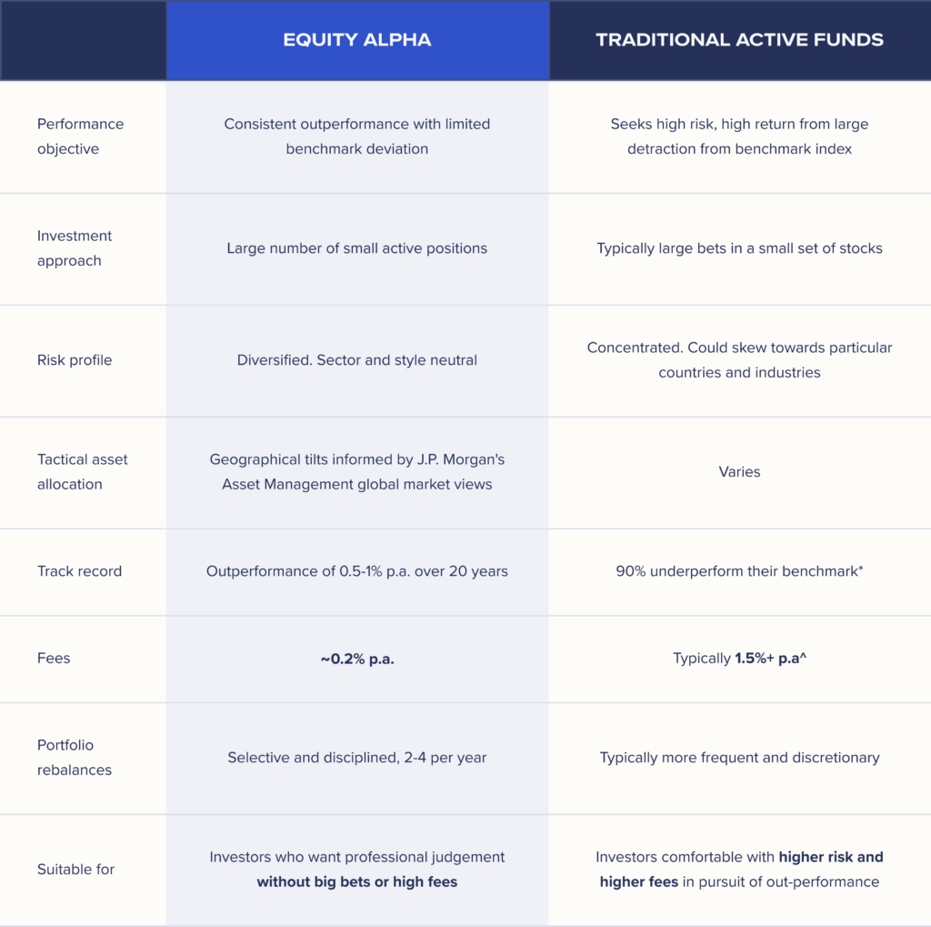 In the case of Equity Alpha, we are replicating strategies that have been run for decades by J.P. Morgan on behalf of large institutions – in a cost-efficient manner.