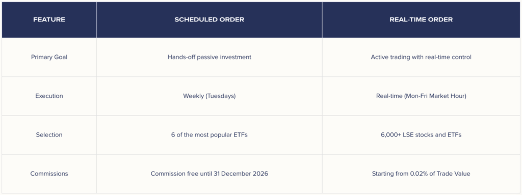 If you prefer a hands-off approach, scheduled orders complement a dollar-cost averaging strategy that lets you build your positions consistently over time. On the other hand, more active investors may prefer real-time orders to capitalise on market opportunities.
