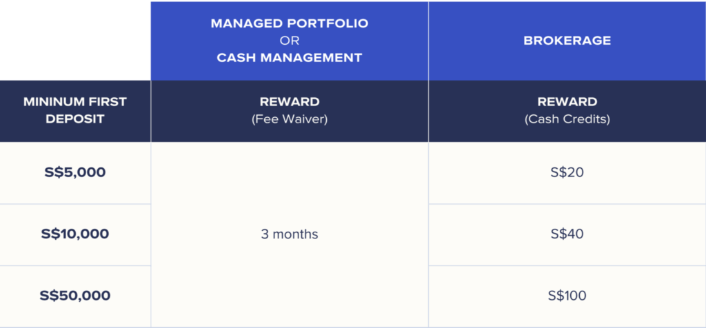 - To qualify for the fee waivers, clients must make a minimum lump-sum deposit of S$5,000 to any portfolio of their choice on Managed Portfolios or Cash Management.