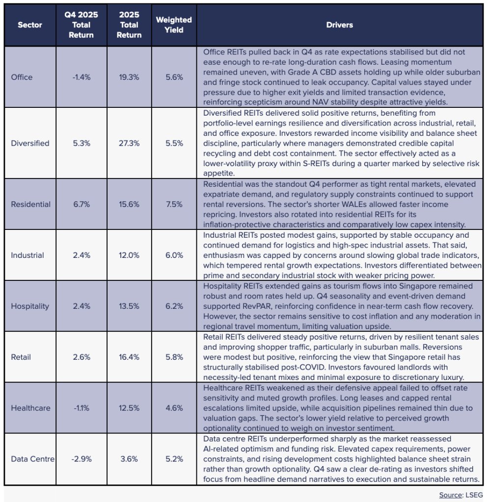 Most REIT sub-sectors in Singapore ended Q4 with a market capitalisation weighted positive total return, but Office, Healthcare, and Data Centres experienced a down quarter.