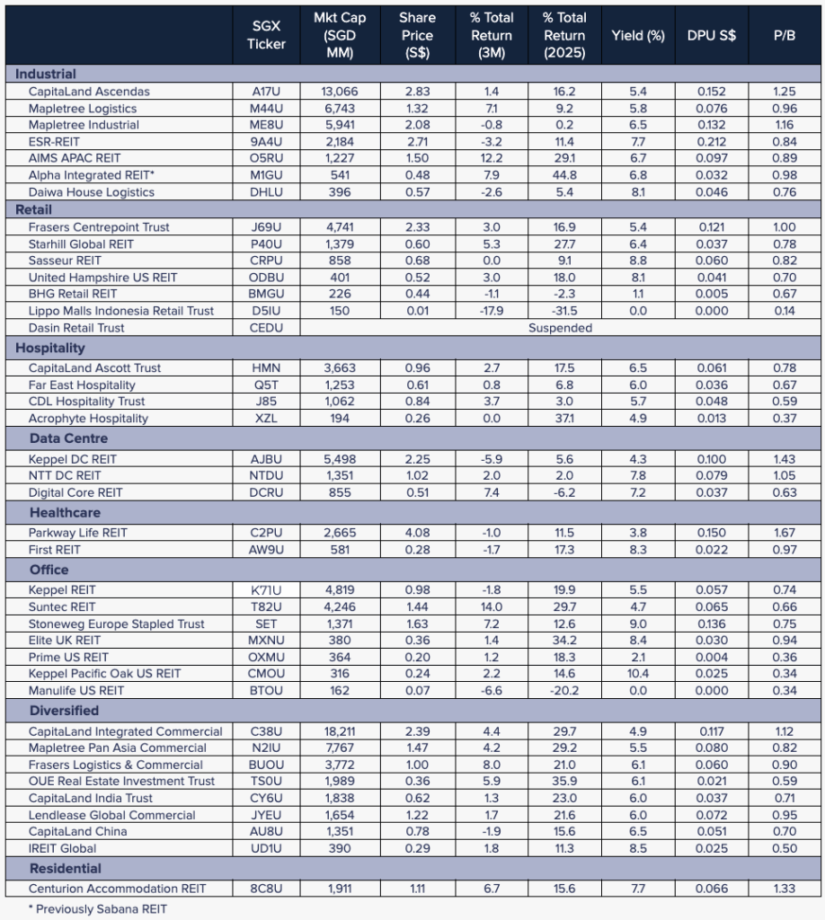 However, the overall sector outlook is positive, with supportive fiscal and monetary conditions in Singapore, paired with the S-REITs’ proven resilience and income appeal, suggest that Q1 2026 will likely bring continued steady performance. Barring shocks, we expect S-REITs to deliver mid to high single-digit total returns in 2026, which would represent a solid outcome following 2025’s rebound. Investors can therefore approach the new year with cautious optimism that S-REITs will continue to shine amid converging tailwinds.