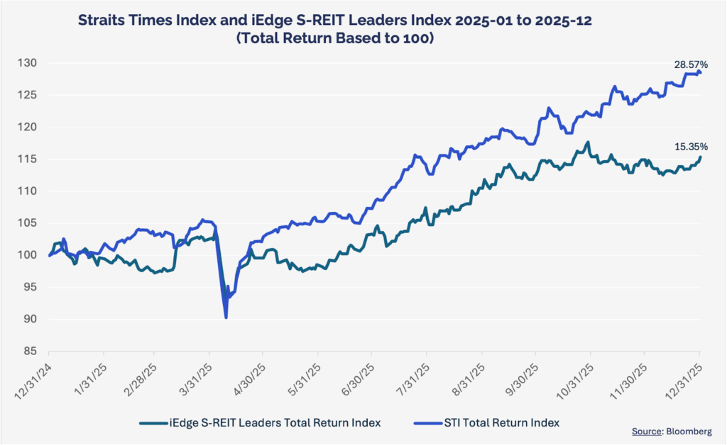 The Straits Times Index (STI) still led with a 28.6% total return in 2025, boosted by bank stocks, but S-REITs’ double-digit gains reinforced their appeal as high-yielding instruments in a stabilising rate environment.