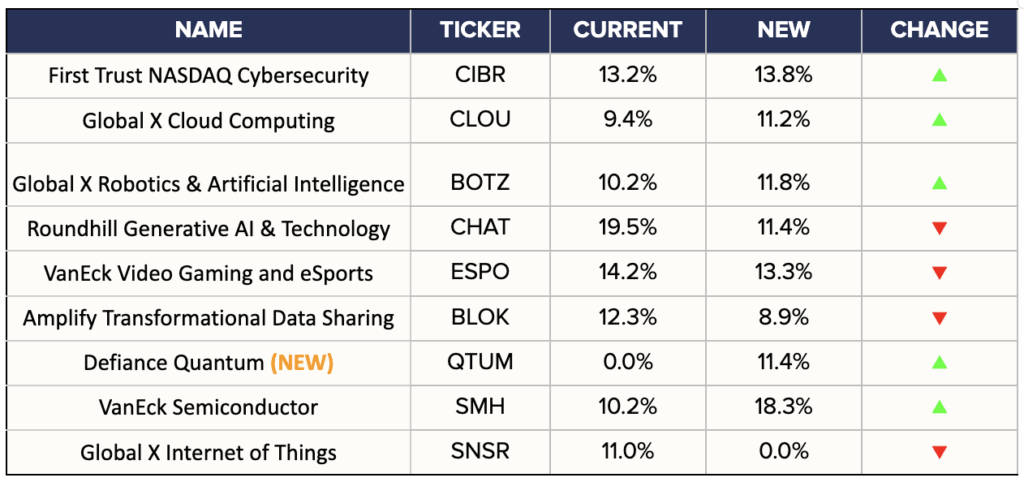 - Increased targeted exposure to the next generation of computing through the addition of Defiance Quantum ETF (QTUM), in addition to our existing Blockchain exposure Amplify Blockchain Technology ETF (BLOK). These exposures represent the new optionality sleeve of the portfolio, positioned for higher potential payoff as commercial adoption of frontier technologies expands.