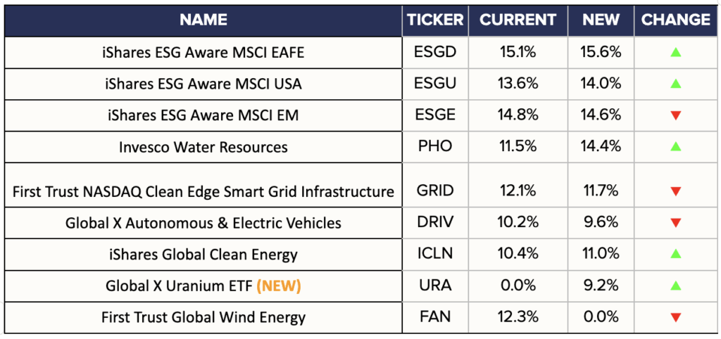 - Removed Global X Internet of Things ETF (SNSR) due to a diminishing forward return profile. The IoT growth theme has now shifted from disruptive to incremental, with much of the adoption in wearables, sensors and smart-home devices already captured.