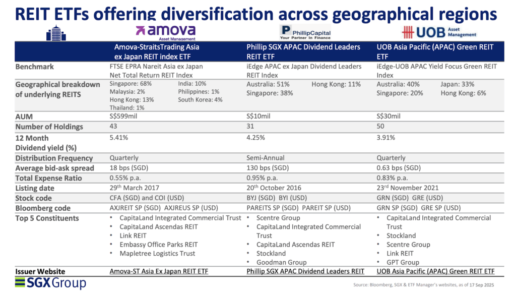 - SGX-listed REIT ETFs that provide Asia-Pacific exposure through a single SGX-listed instrument