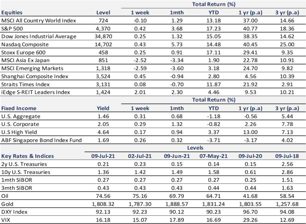 Equity Price Level and Returns: All returns represent the total return for stated period. MSCI ACWI: Global equity index provided by Morgan Stanley Capital International (MSCI). S&P 500: Market capitalization index of U.S stocks provided by Standard & Poor’s (S&P). Dow Jones: Price-weighted index of U.S stocks provided by S&P. NASDAQ: Market capitalization index of U.S stocks provided by NASDAQ. Stoxx 600: Market capitalization index of stocks listed in European region. MSCI Asia Ex Japan: Asia excluding Japan equity index provided by MSCI. MSCI EM: Emerging markets equity index provided by MSCI. SSE: Capitalization weighted index of all A-shares and B-shares listed on Shanghai Stock Exchange. STI: Market capitalization index of stocks listed on Singapore Exchange. SREITLSP: Market capitalization index of the most liquid real estate investment trusts in Singapore.