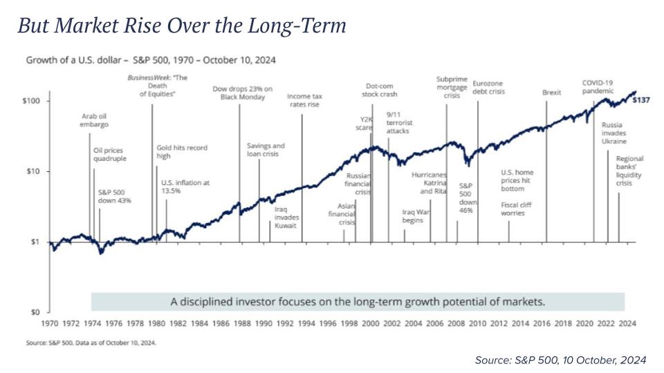 Short-term swings are part of the investment journey. Geopolitical tensions, elections, or policy shocks can trigger sell-offs, but these are usually temporary setbacks in a much longer growth story. Historically, markets have rebounded after every major crisis, from 9/11 to COVID-19.