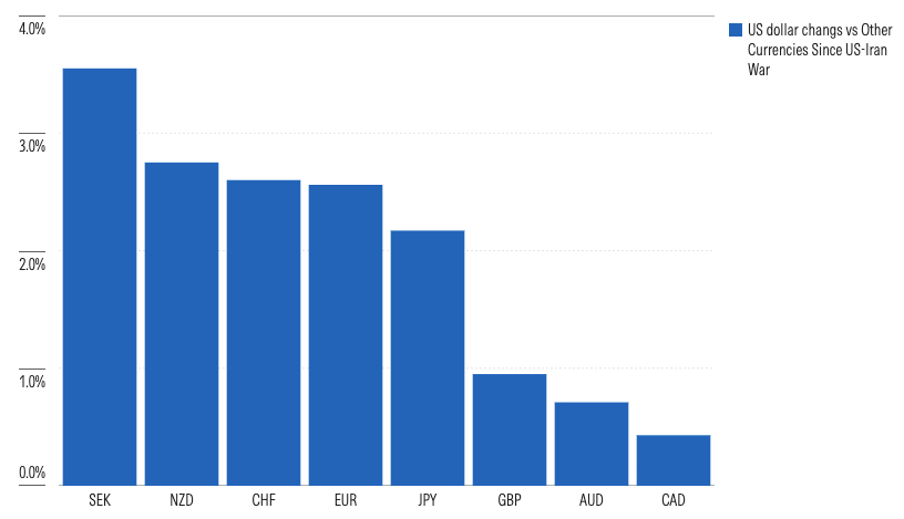 A couple of weeks into the Iran war, traditional safe haven assets have diverged. Bonds and gold have dropped, while the US dollar has rallied hard.