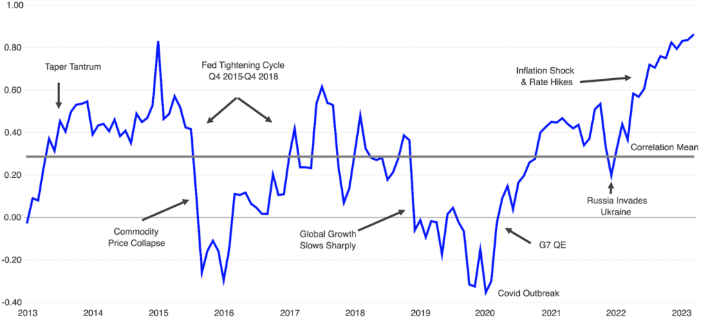 Source: LSEG. Chart shows the correlation of returns between FTSE Global All-World Index and FTSE World Government Bond Index.
